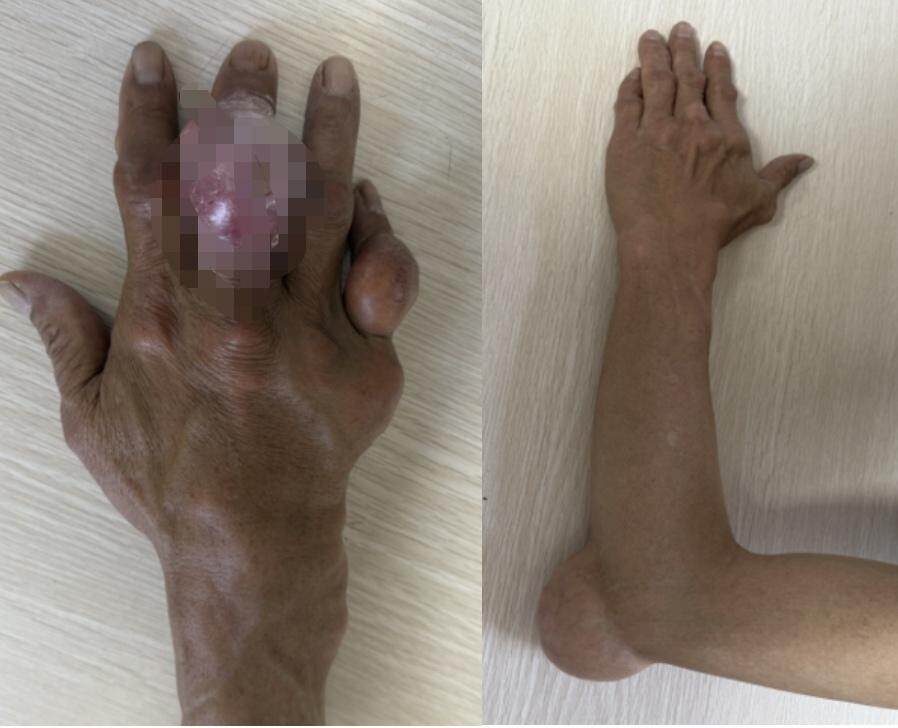 60歲的李先生十多年來飽受痛風(fēng)之苦,痛風(fēng)石幾乎遍及全身,尤其是雙手、雙腕、雙足、雙膝及肘部,關(guān)節(jié)都布滿大小不一的腫物,右中指破潰流出石灰水一樣的尿酸鹽結(jié)晶,局部紅腫明顯感染,各手指均感覺麻木,關(guān)節(jié)活動(dòng)受限。