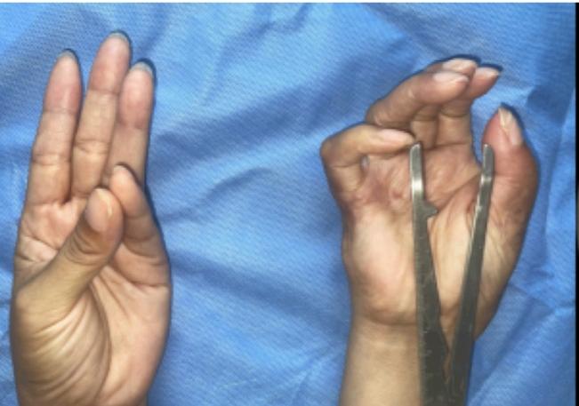 2023年6月25日,由于右拇指掌指關(guān)節(jié)骨性融合,關(guān)節(jié)活動(dòng)受限,影響手部功能,潘女士再次到廣州和平骨科醫(yī)院就診,希望恢復(fù)拇指的功能。