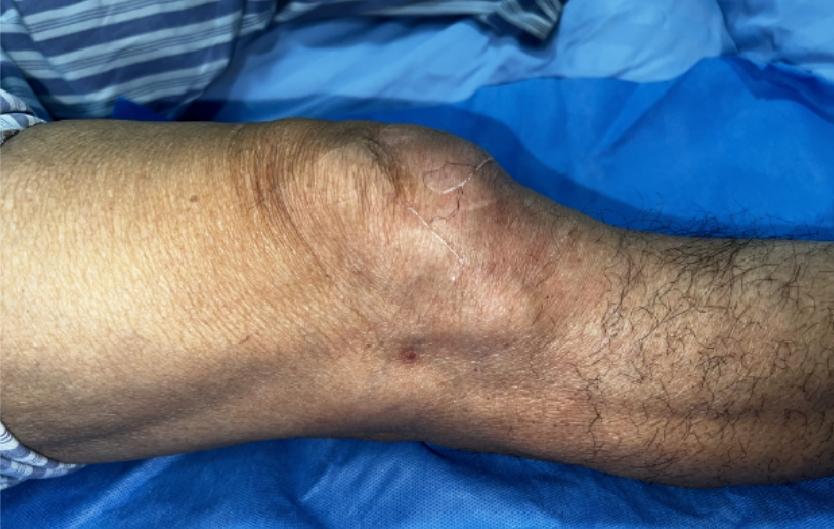 膝關(guān)節(jié)可見(jiàn)有多個(gè)痛風(fēng)石