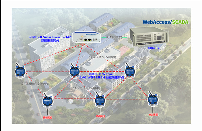 環(huán)境監(jiān)控研華物聯(lián)網(wǎng)無線數(shù)據(jù)采集解決方案,輕松掌控大型廠區(qū)環(huán)境監(jiān)測應(yīng)用地區(qū): 大型廠區(qū) 應(yīng)用產(chǎn)品: Smartswarm-342 網(wǎng)關(guān)、Wzzard 2.4G WIFI MESH數(shù)據(jù)采集節(jié)點、研華IPC、WebAccess/SCADA 項目背景面臨挑戰(zhàn)1. 需要采用無線傳輸 2. 能連接4~20mA, 0~5V傳感器 3. IP67防護(hù)等級 4. 工業(yè)級寬溫設(shè)計 客戶廠區(qū)面積大且監(jiān)控設(shè)備分散,傳統(tǒng)的WIFI產(chǎn)品因傳輸距離問題,可能無法提供好的解決方法,另外一個問題,由于客戶的設(shè)備分散,并非每個位置都能擁有好的供電來源,如果使用標(biāo)準(zhǔn)的WIFI采集模塊,供電選擇上很有可能會出現(xiàn)問題。因此最后我們在客戶的需求點上,新增兩個: 1. 低功耗產(chǎn)品,能支持電池安裝與外接電源,或使用太陽能板供電。 2. 能支持自組網(wǎng) 和客戶溝通確認(rèn)需求之后,我們推薦客戶使用研華B+B Wzzard數(shù)據(jù)感知平臺,以及WebAccess/SCADA作為整體方案的主要內(nèi)容。 方案設(shè)計1. Smartswarm-342 網(wǎng)關(guān) 2. Wzzard 2.4G WIFI MESH數(shù)據(jù)采集節(jié)點 Smartswarm-342網(wǎng)關(guān):