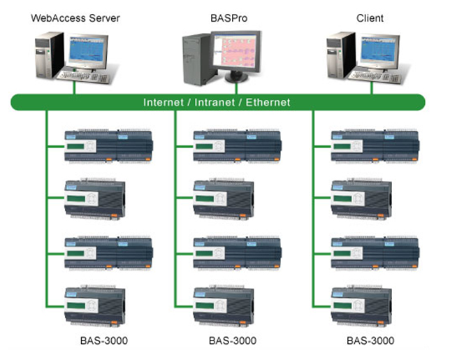 系統(tǒng)架構(gòu)圖:![]() 系統(tǒng)描述:冷源系統(tǒng)監(jiān)控:酒店的冷源系統(tǒng)由冷凍機(jī)組,冷凍水泵,冷卻塔,冷卻泵,膨脹水箱、壓差分路器組成。中央監(jiān)控系統(tǒng)通過(guò)Modbus接口與冷凍機(jī)組共享實(shí)時(shí)通信并監(jiān)控設(shè)備的運(yùn)行狀態(tài),而機(jī)房?jī)?nèi)的現(xiàn)場(chǎng)控制器控制相關(guān)的現(xiàn)場(chǎng)設(shè)備。 空調(diào)及新風(fēng)系統(tǒng)監(jiān)測(cè):五星級(jí)酒店的要求超出標(biāo)準(zhǔn)酒店。鉑爾曼酒店依靠中央監(jiān)控系統(tǒng)來(lái)監(jiān)控所有設(shè)備的運(yùn)行狀態(tài)。各種高精密元件采集酒店內(nèi)的溫度和濕度并通過(guò)空調(diào)室的現(xiàn)場(chǎng)控制器(DDC)來(lái)調(diào)整送風(fēng)機(jī)和加濕器,以確保酒店內(nèi)空氣的濕度和溫度。 送風(fēng)和排氣系統(tǒng)監(jiān)測(cè):酒店的送風(fēng)及排氣系統(tǒng)依靠中央監(jiān)控系統(tǒng)來(lái)監(jiān)控所有排氣裝置的運(yùn)行狀態(tài)以及空調(diào)機(jī)手動(dòng)和自動(dòng)狀態(tài)轉(zhuǎn)換,以確??照{(diào)機(jī)組是否處于樓宇自動(dòng)控制狀態(tài),如果處于此狀態(tài),即可控制通風(fēng)機(jī)的啟停。當(dāng)系統(tǒng)出現(xiàn)異常時(shí),它會(huì)通過(guò)網(wǎng)絡(luò)通信在中央監(jiān)控室的屏幕上以文字或圖像顯示現(xiàn)場(chǎng)狀態(tài),并發(fā)出語(yǔ)音警報(bào)提醒工作人員。重要的數(shù)據(jù)還可打印作為記錄。 給排水系統(tǒng)監(jiān)控:酒店的供水和排水系統(tǒng)依靠中央監(jiān)控系統(tǒng)來(lái)監(jiān)控設(shè)備的工作狀態(tài),包括蓄水池的高/低水位報(bào)警,生活用水水箱的高/低水位報(bào)警,活水泵的運(yùn)行狀態(tài),活水泵的故障報(bào)警,保護(hù)槽的高/低水水位報(bào)警,排水泵的運(yùn)行狀態(tài),排水泵的故障報(bào)警。 總結(jié):以上案例來(lái)自研華官網(wǎng)