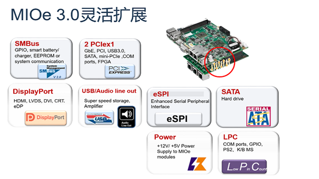 MIOe擴(kuò)展接口是研華自主推行的擴(kuò)展接口標(biāo)準(zhǔn),高度集成的設(shè)計(jì)能夠節(jié)約20%的系統(tǒng)空間。MIOe 3.0包含了如下常用的功能信號(hào),客戶可在擴(kuò)展底板上直接使用,從而可將精力投入產(chǎn)品核心功能的開發(fā),大大加速了客戶創(chuàng)新產(chǎn)品上市。