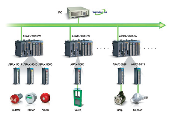 ▌▌系統(tǒng)總覽: 為了滿足Easy Control Technology的要求,研華為APAX-5620KW可編程自動化控制器(PAC)提供了各種APAX數(shù)字和模擬I / O模塊(包括APAX-5040,APAX-5060,APAX-5017和APAX- 5028),以建立一個冗余的系統(tǒng)架構(gòu)來監(jiān)控電閘和除砂設(shè)備。相同的配置還用于監(jiān)視電源系統(tǒng)中的發(fā)電機和配電面板。五個帶有APAX-5013 8通道RTD模塊的APAX產(chǎn)品可采集數(shù)據(jù)并控制泵,壓力,水位,流量,電動蝶閥等。對于這三個區(qū)域的數(shù)據(jù)采集和現(xiàn)場控制,核心是APAX- 5620KW控制器。其雙CPU模塊架構(gòu)獨立運行,可提供高性能計算并執(zhí)行輸入和輸出控制任務(wù)。此外,冗余機制將I / O處理程序存儲在兩個獨立系統(tǒng)中的兩個控制器上。主控制器執(zhí)行I / O操作,當主控制器發(fā)生故障時,備用控制器將自動快速接管。這種獨特的雙控制器架構(gòu)為穩(wěn)定且不間斷的應(yīng)用提供了出色的可靠性。在建筑物的中央控制室中安裝了ATX主板AIMB-781,可機架安裝的ACP-4000機箱和研華WebAccess HMI / SCADA軟件。其易于使用的用戶界面為管理人員提供了動態(tài)圖形顯示和實時數(shù)據(jù)控制。基于瀏覽器的軟件還允許地方和中央政府部門隨時遠程監(jiān)視水產(chǎn)養(yǎng)殖生產(chǎn)區(qū)的狀況。此外,研華還提供了支持簡單網(wǎng)絡(luò)管理協(xié)議(SNMP)的EKI-4654R和EKI-7659C工業(yè)級交換機。通過這些高性能的以太網(wǎng)交換機,該項目的現(xiàn)場硬件設(shè)備與控制室監(jiān)控系統(tǒng)無縫連接,以確保傳輸質(zhì)量。