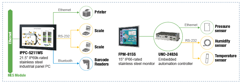 ▌▌研華方案研華科技提出了一個解決方案,包括一個內(nèi)部系統(tǒng)監(jiān)控稱重過程和一個外部系統(tǒng)監(jiān)控稱重室環(huán)境。內(nèi)部監(jiān)控系統(tǒng)選用研華的IPPC-5211WS多點觸控工業(yè)平板電腦為工作站外設(即工作站外設)提供藍牙、RS-232、以太網(wǎng)連接(例如條形碼掃描器、刻度和打印機)。IPPC-5211WS采用了21.5 英寸全高清顯示屏,16:9寬屏幕,不銹鋼設計,7H表面硬度,IP96K防護等級,使其成為潔凈室應用的理想選擇。 對于外部監(jiān)控系統(tǒng),研華提出了UNO-2483G嵌入式自動化控制器和FPM-8151H工業(yè)監(jiān)控解決方案。UNO-2483G控制器具有緊湊無風扇設計,優(yōu)秀的處理能力(第四代Intel® Core™ i7/i3/Celeron 1.9GHz),內(nèi)置內(nèi)存(4/8 GB DDR3L RAM)和多種接口 (4 x GbE, 4 x USB 2.0/3.0, 2 x RS-232, 2 x RS-422/485, 1 x VGA, 1 x HDMI, and 1 x audio)。FPM-8151H顯示器具有15英寸XGA液晶顯示器與LED背光。前面板防塵防水等級為IP65,和IPPC-5211WS一樣,它也采用不銹鋼設計,特別適合潔凈室環(huán)境。