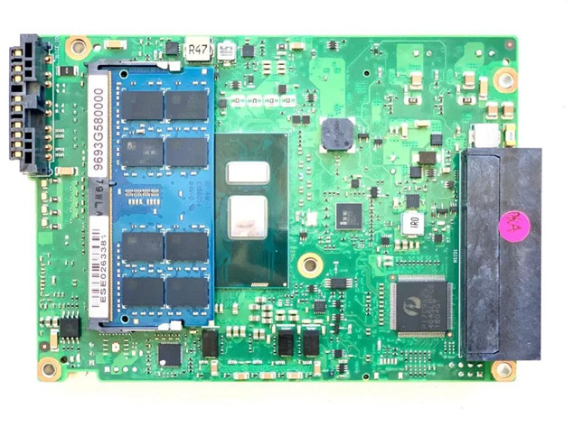 內(nèi)存的大小對(duì)于處理器性能有很大影響,畢竟各種數(shù)據(jù)都是要經(jīng)過(guò)內(nèi)存來(lái)送給計(jì)算機(jī)。在這塊電路板上搭載有兩個(gè)DDR4內(nèi)存卡槽,對(duì)稱的分布在電路板的兩面上。官方資料中說(shuō)最大支持到32GB,也就是一個(gè)內(nèi)存卡槽最大支持16GB的內(nèi)存條。實(shí)測(cè)的這臺(tái)控制器上只插有一根8GB內(nèi)存條,但足以應(yīng)對(duì)小規(guī)模的應(yīng)用場(chǎng)合。
