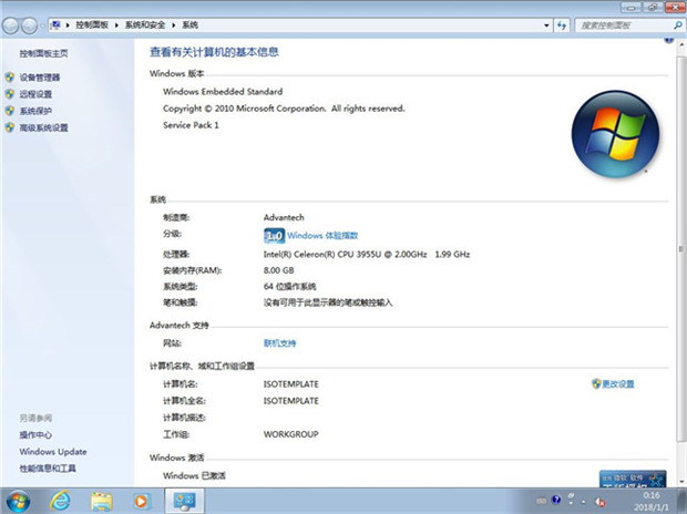研華WISE-5580邊緣控制器系統(tǒng)配置 還是那個(gè)熟悉的Windows系統(tǒng)界面,在“我的電腦”的屬性中可以查看到這臺(tái)計(jì)算機(jī)的更多基本信息。界面顯示這臺(tái)計(jì)算機(jī)的制造商是Advantech(研華),安裝的是64位系統(tǒng),8G內(nèi)存,搭載英特爾賽揚(yáng)3955U處理器,主頻是2.00GHz。