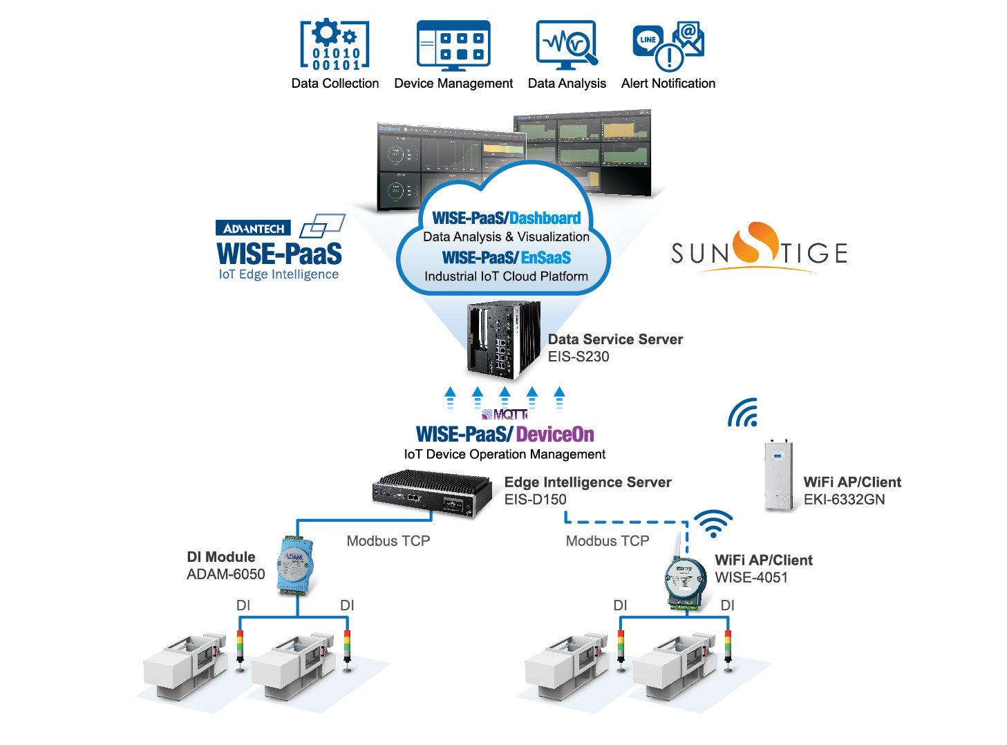 愛良樹脂有限公司成立于1997年, 是一家專業(yè)的塑料注射加工公司,主要產(chǎn)品包括汽車和紡織機械的工業(yè)零件以及手機和BB槍身等消費產(chǎn)品。面對建立新工廠的機會,兩年前,該公司開始計劃向數(shù)字化邁進,以突破現(xiàn)有管理方法的瓶頸。在系統(tǒng)集成商SUNSTIGE的幫助下 ,通過使用研華軟件和硬件與WISE-PaaS云解決方案集成在一起,成功構建了OEE實時監(jiān)控系統(tǒng), 以提高生產(chǎn)效率并創(chuàng)建新 傳統(tǒng)管理方法:努力提高效率I-Liang樹脂有限公司特別助理Kelvin Chang表示,盡管該工廠過去是通過ISO標準進行管理的,每天都會生成有關機器利用率和產(chǎn)量的報告,但數(shù)據(jù)還是以電子或紙質形式存儲格式,無需進一步的組織,分析和可視化。這個過程使得很難從收集的數(shù)據(jù)中獲得有價值的見解。因此,管理人員和操作員很難了解實際的生產(chǎn)情況。 此外,I-Liang的原始工廠是傳統(tǒng)的鈑金工廠,其機器位于同一樓層。管理人員通常走到一臺機器上以了解其運行狀態(tài)。但是,在搬到新工廠后,注塑機和管理人員現(xiàn)在位于不同的樓層。如果采用傳統(tǒng)的四處走動管理方法(MBWA),效率將會受到影響。因此,I-Liang決定部署遠程監(jiān)控來確定機器的狀態(tài),然后集成信息以實現(xiàn)數(shù)字管理。 研華的WISE-PaaS解決方案與SUNSTIGE合作,展示了數(shù)字化管理的有效性盡管SUNSTIGE是一家成立于2017年的初創(chuàng)企業(yè),但該團隊的背景是塑料成型,他們已經(jīng)成功地幫助了一家著名的塑料公司構建了智能制造解決方案。由于這些原因,SUNSTIGE贏得了I-Liang的青睞,并共同建立了緊密的合作伙伴關系。 SUNSTIGE副總裁曾瑞博士說,該項目的引進過程始于現(xiàn)有設備的聯(lián)網(wǎng)能力。在考慮上層軟件和應用程序要求之前,首先要構建底層硬件。SUNSTIGE的想法是將收集的機器操作信息與第三方系統(tǒng)(例如ERP)集成,然后與訂單和工作訂單建立聯(lián)系,以將整個流程(從頂級商業(yè)訂單到下層生產(chǎn)環(huán)節(jié))進行鏈接。 “我們是Advantech硬件的當前客戶。經(jīng)過進一步聯(lián)系,我們發(fā)現(xiàn)了 WISE-PaaS云平臺。盡管SUNSTIGE專門研究工業(yè)應用知識,但是云架構并不是我們的專業(yè)知識。我們需要來自諸如Advantech的合作伙伴的服務WISE-PaaS平臺上的解決方案確實可以加快我們的部署。因此,我們很快決定采用研華的軟件和硬件解決方案。” I-Liang采用的研華解決方案包括: 用于連接塑料注塑機的 ADAM-6050 或 WISE-4051 DI模塊, 用于收集邊緣信息的 EIS-D150服務器, 用于數(shù)據(jù)收集的 WISE-PaaS工業(yè)IoT云平臺,存儲和管理,以及 用于云數(shù)據(jù)分析和可視化的 WISE-PaaS /儀表板。 曾博士說,通過使用WISE-PaaS /儀表板,安裝后可以顯示生產(chǎn)狀態(tài)并快速實現(xiàn)可視化。這只花了一天的時間-使I-Liang能夠在最短的時間內(nèi)查看工廠的狀態(tài)。一旦I-Liang感到有信心,其他信息就會被相繼連接起來。 I-Liang于2019年1月正式遷入新工廠,整個工廠的機器現(xiàn)已投入使用。張開文說,到目前為止,管理人員可以通過儀表板可視化,清楚地看到工廠中每臺機器的實時運行狀態(tài),并準確掌握機器的啟動時間,以減少人為記憶或記錄錯誤并輕松掌握利用率數(shù)字化顯示整個工廠的生產(chǎn)率和生產(chǎn)進度。此外,由于數(shù)據(jù)的完全掌握和可追溯性,如果任何產(chǎn)量異常,則可以迅速找到時間和原因,可以進行統(tǒng)計分析,并且可以有效地解決問題以防止再次發(fā)生。如果任何機器有問題,將自動發(fā)送LINE或電子郵件消息以立即通知并快速響應。通過有效掌握機器的生產(chǎn)時間,還可以進行預評估,為換模做準備并及早進行布置。這樣,工廠的整體效率得到了顯著提高。 基于OEE實時監(jiān)控的成功,I-Liang和SUNSTIGE現(xiàn)在計劃引入智能模具管理系統(tǒng),以提高300到500套塑料注塑模具的管理效率。同樣,兩家公司希望通過添加諸如模具維護和計劃可視化之類的功能,以及與用于原材料管理和控制的系統(tǒng)集成,來構建更全面的智能制造管理模型。 WISE-PaaS OEE塑料注射液解決方案的體系結構